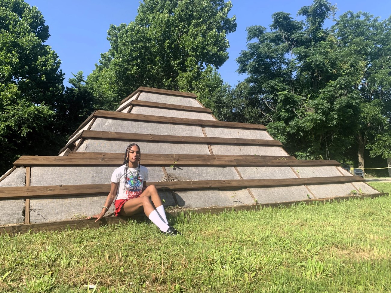 Utē Petit sits on the edge of one of her mounds. She was able to purchase the land her great-grandmother used to live on before Hurricane Katrina and is turning it into a community garden. Photo by Eva Tesfaye, WWNO