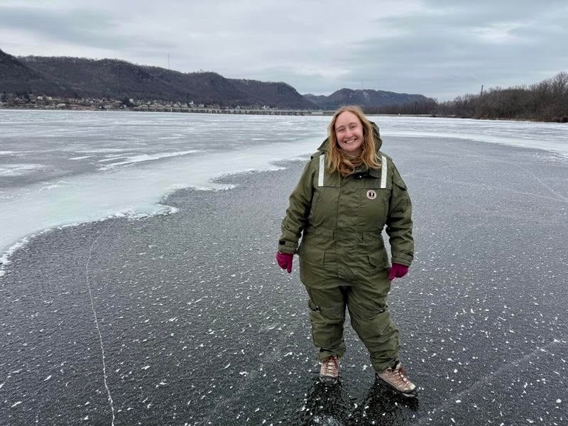 Desk reporter Madeline Heim stands on the frozen Mississippi. Credit: Mark Hoffman/Milwaukee Journal Sentinel |