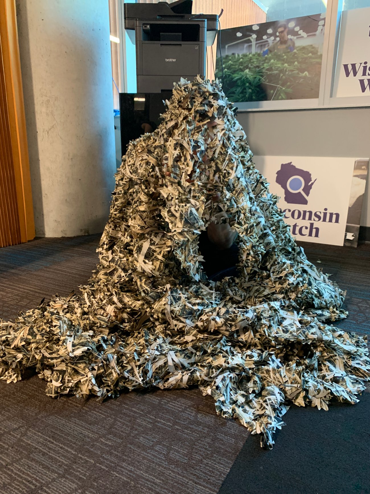 Desk reporter Bennet Goldstein of Wisconsin Watch prepares for his beaver expedition by testing a camouflage suit. Though effective visually, it ended up being too loud for the task. Credit: Coburn Dukehart/CatchLight |